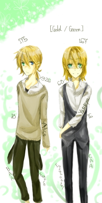 14 April 時の流れは。 ↑ シルヴァン&藍 / 禁断美術館、C.D?昨日の続きで今度は金髪碧眼組!意外といないなーと思った。数値も昨日と同じで、上から身長、誕生日、年齢、運動能力と頭脳と容姿のランクです。昨日の運動得意組から一転、今回は頭脳派ですね!同じ頭脳派ですが、シルヴァンの賢さは計算高さというか狡賢い感じなので、藍の賢さとはちょっと違う感じです。藍は普通に理系な頭の賢い人かなー。あと、シルヴァンはフランス人、藍は半分ドイツ人という欧州人組なので、二人とも身長高い方。藍はたぶんまだまだ伸びます。ちなみに家柄いうか金持ち度を表すと、シルヴァンがAの藍がCで、ここだけはかなりはっきり差が出るかも。シルヴァン家は没落貴族のくせにちゃっかり貿易で稼いじゃってるからね! 計算高いからね!(笑)お次は金髪に翠眼組の予定ー。だらだらするのも今日で終わりな朝月です、こんばんはー!明日からは朝起きなくちゃです。なんかこの発現に今日までの駄目さが全て込められてる気がする(笑)最早過眠症で起きられないかもしれない気がするくらいですだらだら~←だらだらするくらいなら何かすればいいのにね、と思いつつ、何やったっけって考えると部屋片付けたとか本棚片付けたとか漫画読んだとか雑誌片付けたとかそんなのばっかりです。なんか……片付けちゃうんだ、本……。あのテスト前とかあとは忙しい時とか?に何かを片付けたくなるのは何なんだろうか。ホントに。そういえば何なんだろでもう一つ。不思議なことに、バイトに行く前は「働きたくない、つか働いたら負けだと思ってる」的なニート思考でだらっとしてるのに、行ったら行ったで「ひゃっほーバイト楽しいぜ!」な感じになるんですよね……。これも何なんでしょう?^^;ではではこれにて ノシ次あたりバトンやりたいですー。