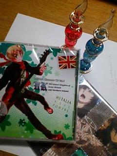 20 August 早速行ってみた。 こんばんは、朝月です。一昨日お医者様から出かけていいよと許可を頂き、本日早速出かけて参りました!午前に新宿で映画を見て、そのまま移動して午後は横浜で海のエジプト展。んで帰りがけに渋谷のメイトとTSUTAYA。結構時間的にハードでした^^;映画はMWを見たんですが、なんというか、こう……部活仲間から妙な先入観を頂いていて……。("MWはBLだ"というものですが……。)それについてはノーコメント;;面白かったとだけ言っときます。最後気になるなぁおいっ! て感じでした。1時くらいに終わって横浜行って、ご飯食べたら3時でした。もうおやつの時間じゃん!あ、でも五右衛門のパスタはおいしかったです^^ 明太子と黒豚と~って奴。あれははまる。てゆか海のエジプト展。歩いて見てたら、右足の膝裏が痛くなりました。あれ? ヤバいかこれ?でもそのまま見続けました。← 海中に沈んだアレクサンドリアやヘラクレイオンやカノープスから引き上げられた発掘品が展示されていたのですが、一番感動したのは展示品ではなく、コンピューターグラフィックス映像だったとかいう。(笑)床に水の映像が映っているのですが、そこを歩くと波紋が広がるという! 水も蹴れるし、近付くと魚も逃げてくんですよ! すごい!!入り口と最後にあったんですが、めっちゃ遊んできました^^ マジ楽しかったです♪展示品で一番印象に残ったのは、ヘムヘム冠。ヘムヘムって……!(笑)バーチャル体験シアターなんていうものもありまして、再現されたアレクサンドリアの景色が3Dで移されていました。でもあれ、絶対リモコンがプレスのだった……。個人的にそれを見れる機械もあって、私はそれで3分の時間制限の間、ずーっと灯台ばっか見てました。アレクサンドリアの景色は見なかったという。(え)灯台いいですよ、灯台。あ、あと空の映像も綺麗でした。(そんなんばっか)ちなみにコントローラーはファミコンのそれでした。何故だ……?それからお土産↓右上に移ってる香水瓶2つです。赤か青かさんざん迷って、結局両方共買いました。満足! 部屋に飾ります^^ ちなみに写真は今日の戦利品(?)。帰りに渋谷のメイトで願望通りイギリスのキャラソン買いました♪ 初回版残ってた^^ヤバい、風邪ひいたイギリスが可愛すぎるv 今も聞いてます♪右下のはガンダムOOです。アニメイト渋谷店のブックフェアで貰ってきました。ヘタリアも景品にあったのですが……50ptは高すぎだろっ。書籍1冊につき1ptなので、全部マンガでも"420円×50=21000円"。そんなお金はないですよ……!;;そんな感じで遊びほうけてきました^^明日からはまた絵を描いてますー。ではではっ。