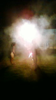 08 August 逝ってきました。 逝ってきました、合宿に。気持ち的にはこの字で合ってますから!帰ってきたのは今日じゃないのですが、ずっと寝てて寝てて寝てまして。(寝てばっか)一昨日は午前部活行って午後は寝て、昨日は午前寝て午後部活でした。どんだけ寝てんだ自分。(笑)今日こそは! と思った今日も、結局目標よりも一時間遅く起きました。←そしてだらだらと合宿について述べてみる。そのいちー。剣道部の合宿って、大学生コーチがいらっしゃるんですよ。しかし四日目の午後練、ランニングが終わっても、体操が終わっても、礼式が終わっても、素振りが終わってもコーチがいらっしゃらない。三人いらっしゃるのですが誰一人として。流石に先生が一年生にコーチを呼びに行かせたところ、帰ってきた一年生の報告は、「先生、コーチ全員寝てました」その時点でマジかよって思ったのですが、それを聞いた上級生の呟きは、「何で冬眠中のクマ起こしちゃったんだよ……!」これに一人吹いてました。(笑)コーチ=クマかよっ!そのにー。弓部合宿での行きの最中の出来事。新幹線の中でお昼ご飯を食べていたのですが、友人が割り箸を割ろうとしたら、箸が真ん中で横断列を起こしました。仕方なくテーピングで繋げて使ったのですが、おかずを一口サイズに切り分けようとしたところ、今度はもう一本の箸も横断列を起こしました。そしてテーピングで補強。その結果。↓哀れ箸……。そしてそのさーん。今度は自分のアホ行動でして、剣道部合宿の最終日に変な踏み込み方をしたらしく、右足首が微妙に痛くなったんですよ。しかしその状態で、弓部合宿の最終日前日、バーベキュー後のだるまさんが転んだを全力疾走。(アホ)晴れて悪化しました。わはは。←やーでも爪先立ちってすごいですよね。これなら歩けますもん!←←……月曜日には、医者行きます、はい…。そしてそのよーん。同じくバーベキュー後の花火にて、煙を利用して個人的にめっちゃいい写真が撮れました。それがこれ。↓人影は友人です。永久保存決定ですから!ちなみにこの後挑戦した奴は、煙の量が少なくてだめでした……。特筆すべきはこんなもんだったかなー。ホント乱雑に述べてみた^^そんでもってサイトですが、そろそろ開設して一年だったりするので、その日までにはイラストをupしたいなーとか思ってます。実行……するぞー!うっすーい案はあるんですよ、うっすーい案は……。それからサイトじゃないけどバトンやりたいです。面白そうなのを拾ってきたので。ここ10日間ちょいの間、拍手ぽちぽちと下さった方々、ありがとうございます!一つ一つが神様です!!(真剣)最後に私信一つ残して終わります!届くんですかとかいつもの話だ!←>>晃様晃様、お誕生日おめでとうございます!ホント言葉だけで申し訳ありませんが……てかいきなり私信とばして申し訳ありませんが……;;ふらふらしてて滅多に顔を出さない私ですが、晃様のことも晃様の創り出される作品も大好きですvこれからも影からこっそりついてゆきます!