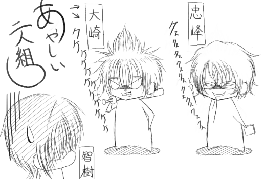 13 August 今日も何だか……。 ↑ 左から:智樹、大崎、忠峰(タダミネ) / オリジナル 色なし鉛筆書きの、何だかよくわかんないもの。 大崎と忠峰は、登場する物語の本編にはあまり関係なかったりする。 一応この三人は友達で、刹那と蓮を含めて何だかよくつるんでいる五人組。 今日も何だか書くことがない一日でした。 ヒロインの紹介絵を描いていたんですが、そっちも終わらなかったし……。 あ、でも友達と喋ってましたよ、久々に。 何か色々とお勧めの曲を聞かせてくれました。ほとんどよく分からぬまま終わりましたけど。 でも、女性歌手だっていうメビウスさんの曲は、確かにいいかもなぁと思いましたっ。 TSUTAYAにもあるらしいので、今度借りてみよっかなぁ……。 てかその前にカード作んなきゃっ! 後は、「ラドウィンプスとバンプオブチキンを聞いていないから、お前は人生の130%を損している!!」とか言われたなぁ。前者が50%、後者が80%だそうで。 明日は久々の部活、剣道部です! 今までにやったこと、覚えてるかなぁ自分……; それでは~^^