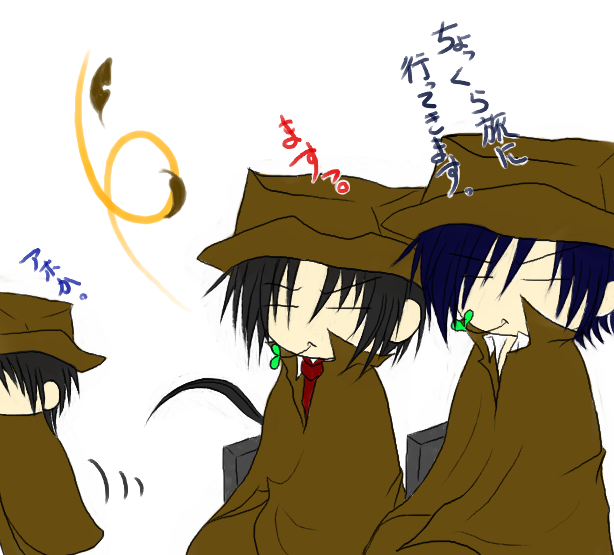 30 July 飛ぶ、飛ぶ、飛びます。 ↑ 左から:蓮、刹那、智樹 / オリジナル ちょっくら旅に行ってきます。そんなわけで、更新ストップ宣言です。 飛ぶんです。アッチの方に。二週間ほど旅行に行きます。 なのでその間は全く何も出来ません。日記書けない……; ケータイも使えないので、もうどうしようもない; 帰ってきたらドバッと旅行の感想書こうかなぁと考えてます。 疲労と睡魔に負けて書かないかもしれないんですけどね;; まぁそんなことを書くので、今日の日記絵はこんなものになりました。 旅にでるっぽい格好の三人組。 アホなことやってくれそうな智樹と、それにノりそうな刹那。んでこの二人を描いたら、三人組の残り一人もってことで蓮を描いてみたりしました。 こいつら三人は、しょっちゅうつるんでますから。 ……何か久々にこのサイズで描いた気がします。てか日記絵二日連続がすっごい久しぶりだ! 色々準備とかするんで今日は早めに日記書こうかな、と。 今日は朝から弓道場に駆け込んで、提出物だけ出して、そんでもってその下にある剣道場で剣道してました。 弓道場って剣道場の上にあるんですよ。だから近くて便利です♪ 部活中は、とにかく素振り! 自分は一向に筋力がついちゃいないので、振り続けたり、速度を上げようとすると、めちゃくちゃ形が崩れます; 素振りをサボってるせいだな……。家で全然やってないし。 ま、そんなこんなで振り続けて、またもや豆がつぶれました! わーっ!; 幸いにも、今回の豆はつぶれて痛くはありませんでしたけど。よかったぁ。 足の裏とかにも豆が出来たりして、手の豆も直りかけていたのに再び成長したりして。 まぁきっと旅行中に直るさ。そして再び筋力も落ちるさ。(え 小手とかも教えて頂いたんですけど、忘れちゃいそうで心配です; むぅ……イメトレ、イメトレっ。 ――んな感じで。 後は旅行の準備をせねばっ。手荷物だけ用意してないもんで; 次は二週間後、ですね。 それでは~^^